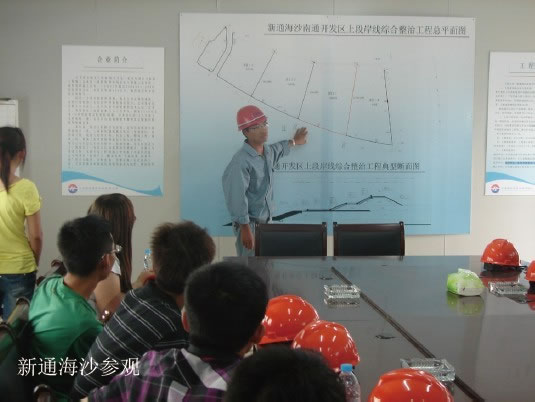 和施工進展情況,并帶領大家參觀了海新碼頭、船體車間和建造中的船塢。在新通海沙項目工地,項目經理張小建向大家介紹了工程概況、施工重點和難點,以及項目部的同事們如何群策群力,奮勇攻堅,保質保量如期完成工程。隨后,大家徒步前往即將完工的工地參觀。