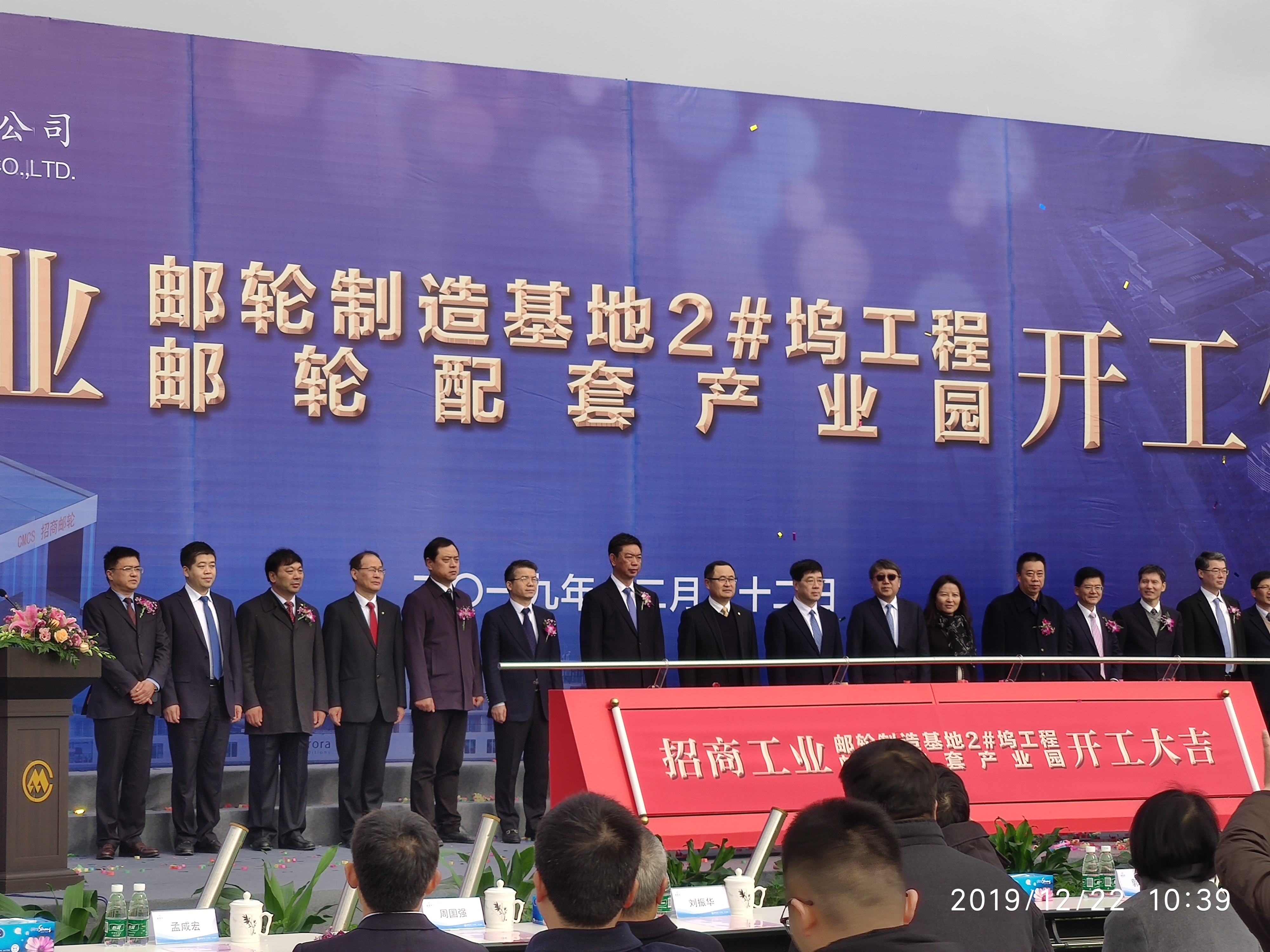12月22日,公司董事長孟咸宏出席了招商工業海門基地2#塢工程暨配套產業園舉行開工儀式。招商集團總經理胡建華、副總經理王崔軍;南通市委副書記沈雷,海門市委書記陳勇、市長郭曉敏等領導、嘉賓參加開工儀式,并共同為該工程及產業園開工推桿。