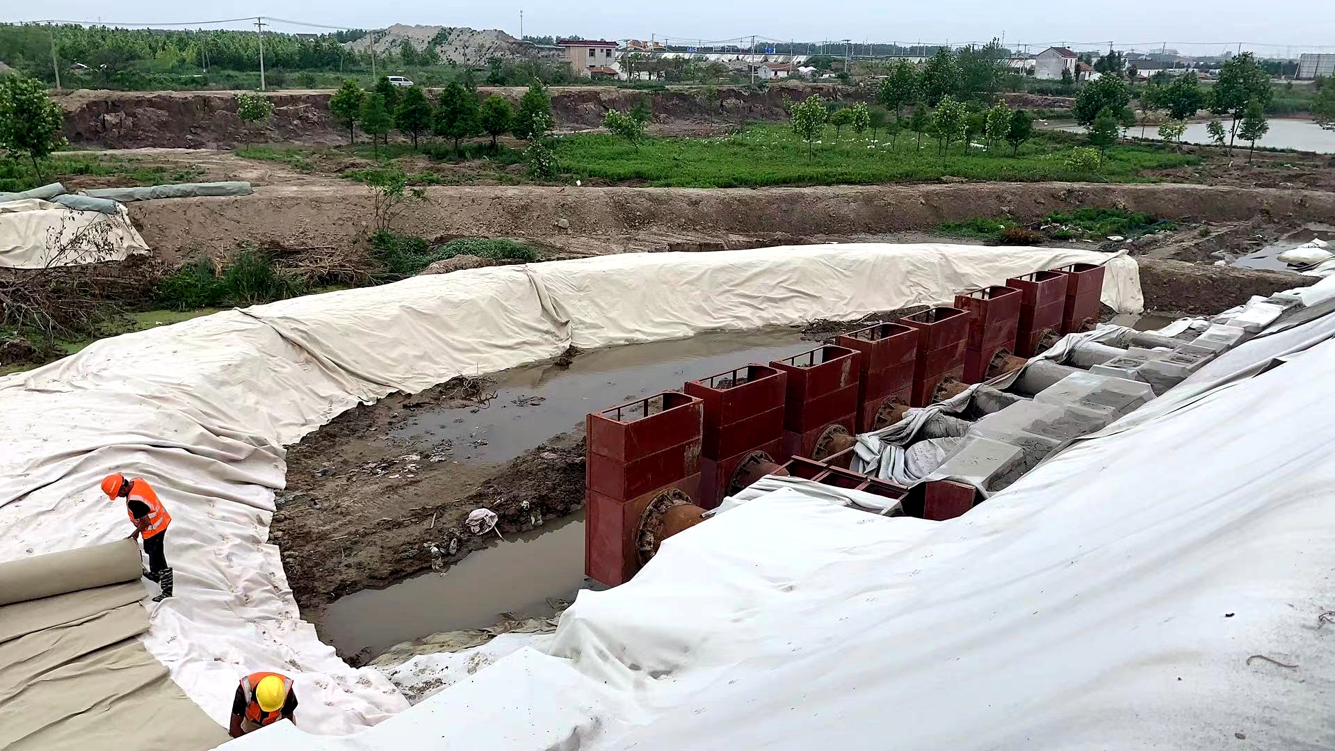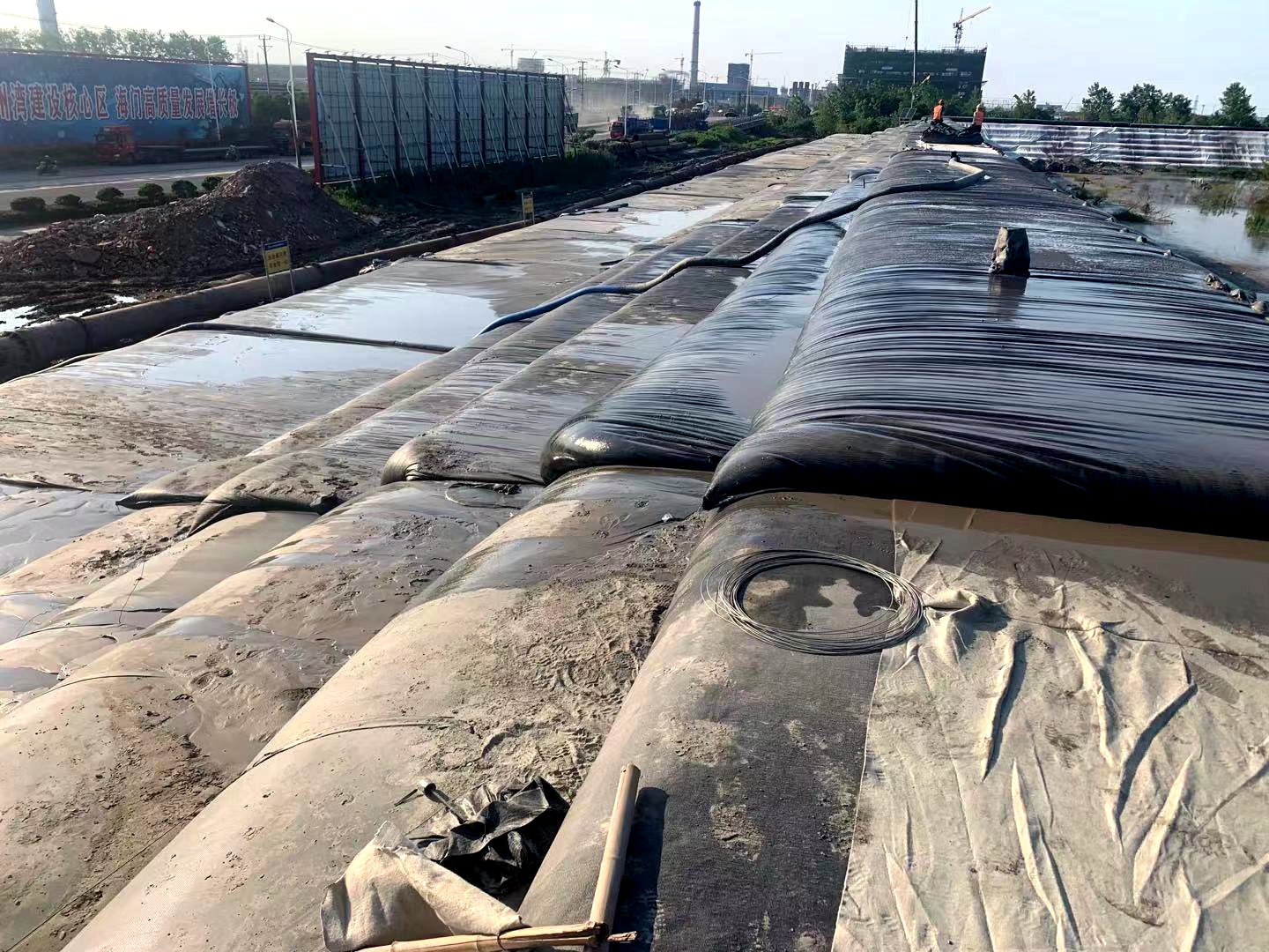 本項目自2021年3月4日開始施工準備,先后進行了耕植土轉運、堤身地面清表以及圍埝堤身充填砂袋。截止目前為止,耕植土轉運以及清表工作已完工,預計于5月25日完成堤身的主體結構,五月底對圍埝進行合攏。