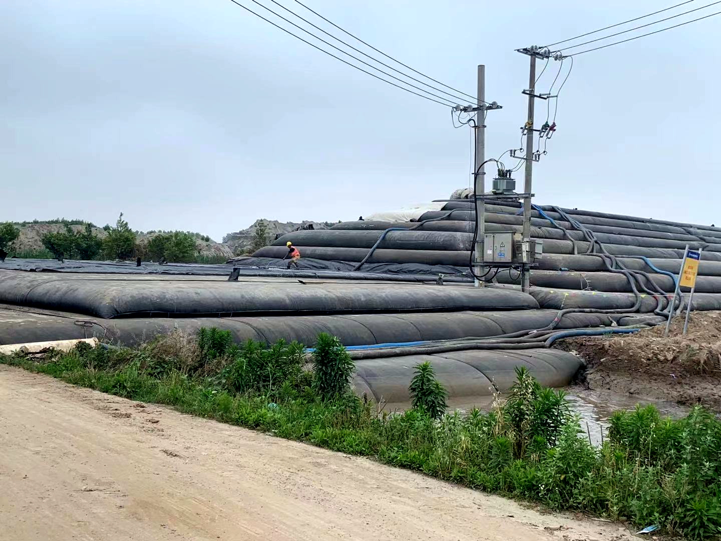 截止目前,現場施工用水,用電已解決,施工區域除兩處居民房未拆遷,其余均搬離工作區域,充填袋也正平穩,快速地往前推進。