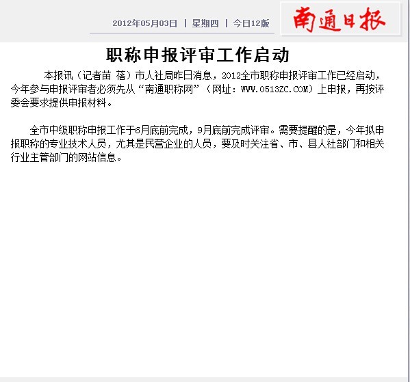南通日?qǐng)?bào)《職稱申報(bào)工作啟動(dòng)》